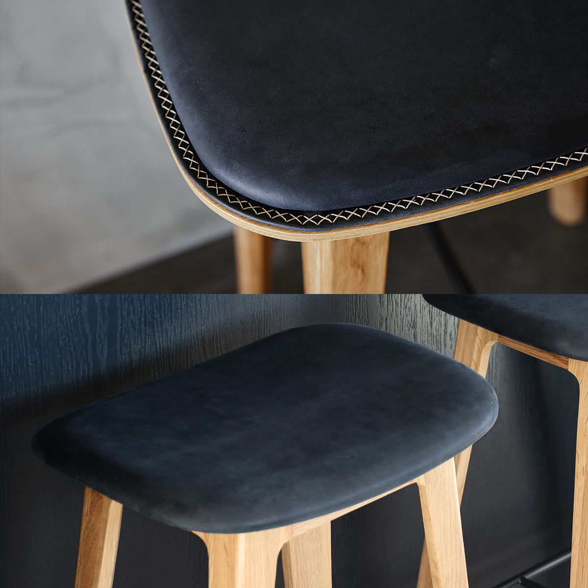 Der findes to forskellige sæder til vores barstole: et fuldpolstret sæde og et delpolstret sæde. Varianterne giver dig mulighed for at vælge det sæder, der passer bedst ind i din indretning.