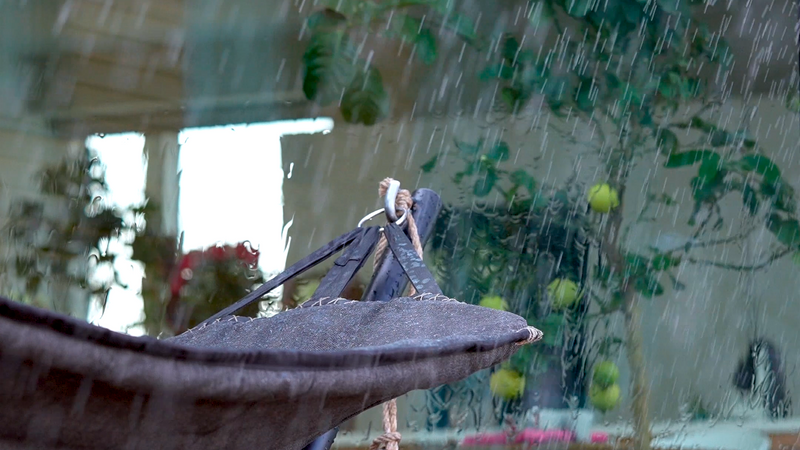 Cobana Hammock tåler vand, men du kan med fordel tippe køjen, så regnen nemmere driver af køjen