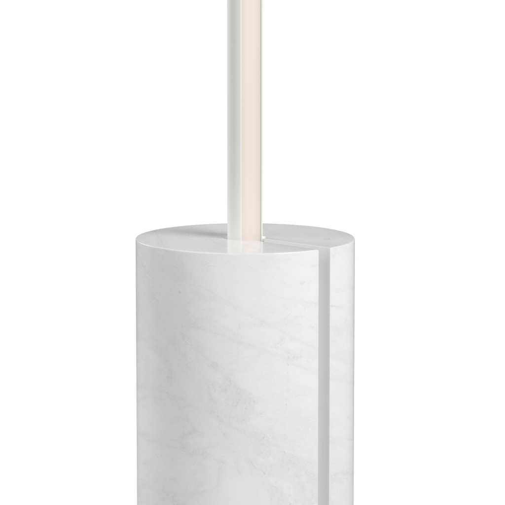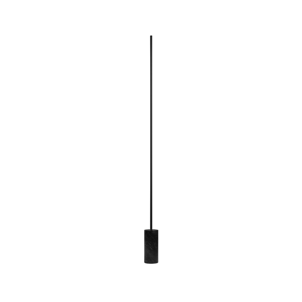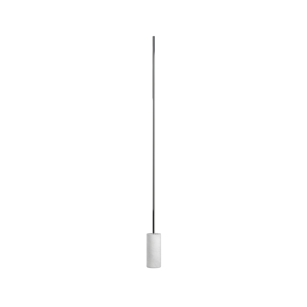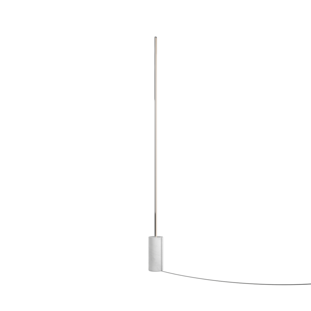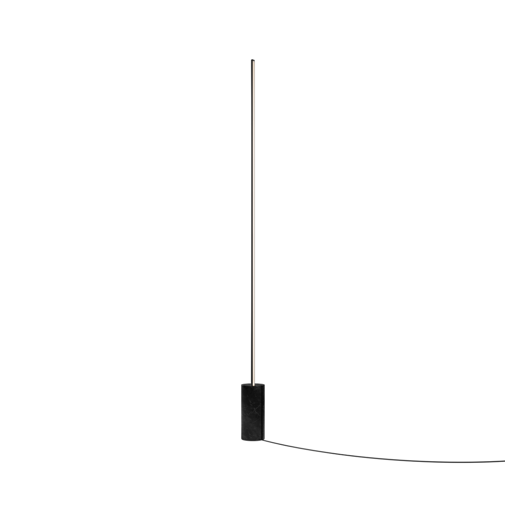 Expo 185 er en gulvlampe, der næsten virker som en streg tegnet i rummet. En slank aluminiumsprofil løfter det vertikale lys op ad væggen, mens den massive marmorfod giver ro og balance. Den fylder forbavsende lidt, men står med en tyngde, man kan mærke.