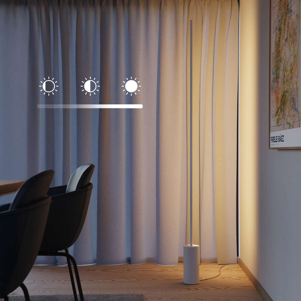 Det er lampen, der finder plads dér, hvor du ikke troede, der var plads til en lampe. I hjørnet mellem sofa og væg. Bag lænestolen. I soveværelsets smalle niche. Det opadrettede, matterede LED-lys skaber en blød, varm glød, som ikke blænder, men bygger stemning lag for lag. Lysstyrken justeres trinløst med fodpedal, så rummet kan skifte karakter på et øjeblik.