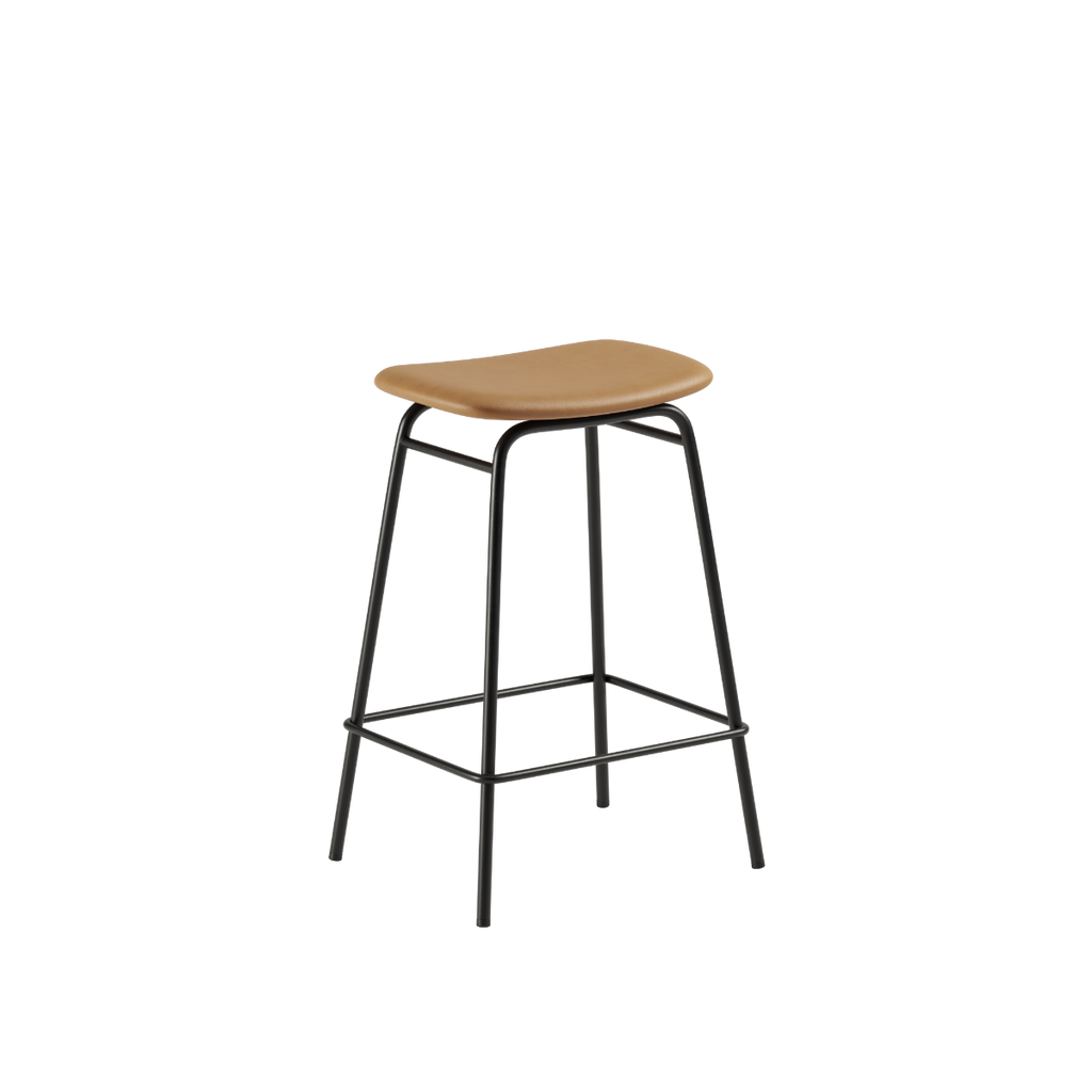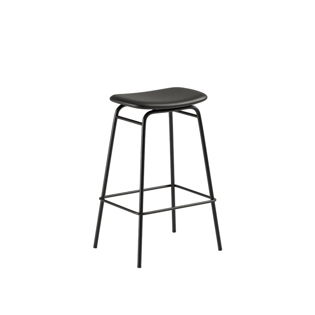 Sædet er betrukket med ansvarligt produceret kvalitetslæder fra SPOOR, som er nemt at rengøre og bevarer sit udtryk over tid, mens det pulverlakerede stålstel bidrager til barstolens industrielle formsprog.
