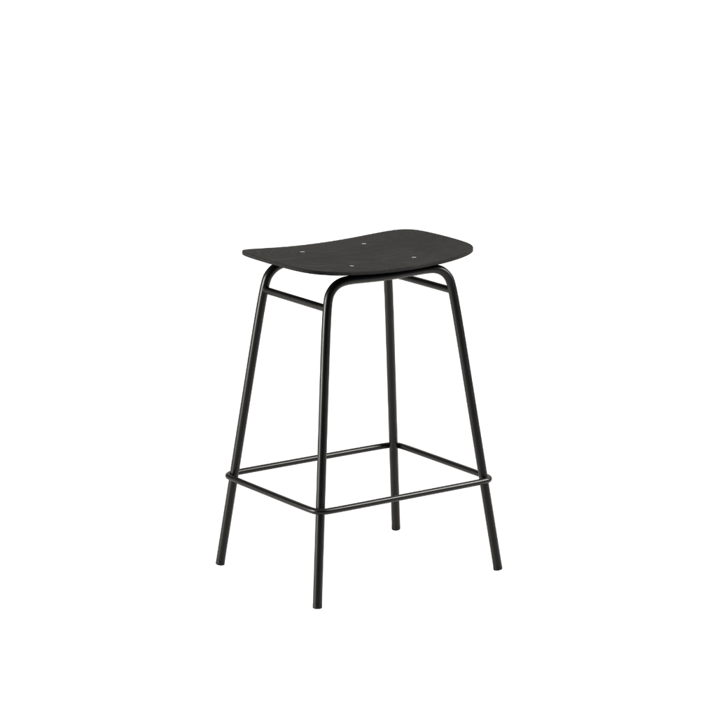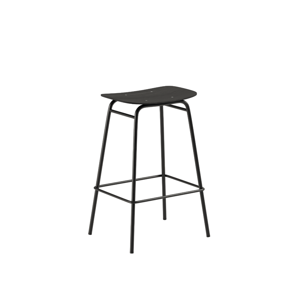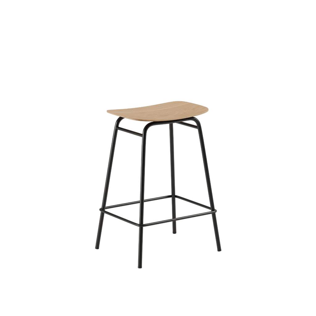 Barstolen består af et sæde i egefinér med en mat finish, der fremhæver træets naturlige struktur. Stellet i pulverlakeret stål tilfører en rå kant og et industrielt formsprog.