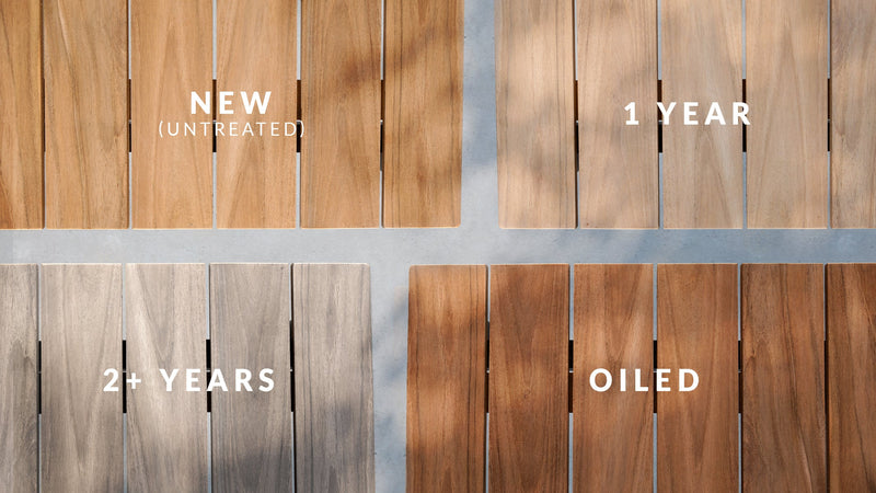 Teaktræ kan holde i mange år uden behandling, men vil uden behandling blive gråt med tiden som følge af regn og sol. Hvis du vil undgå den grå farve skal du jævnligt give det olie. Se vores teaktræsguide for pleje og vedligeholdelse.