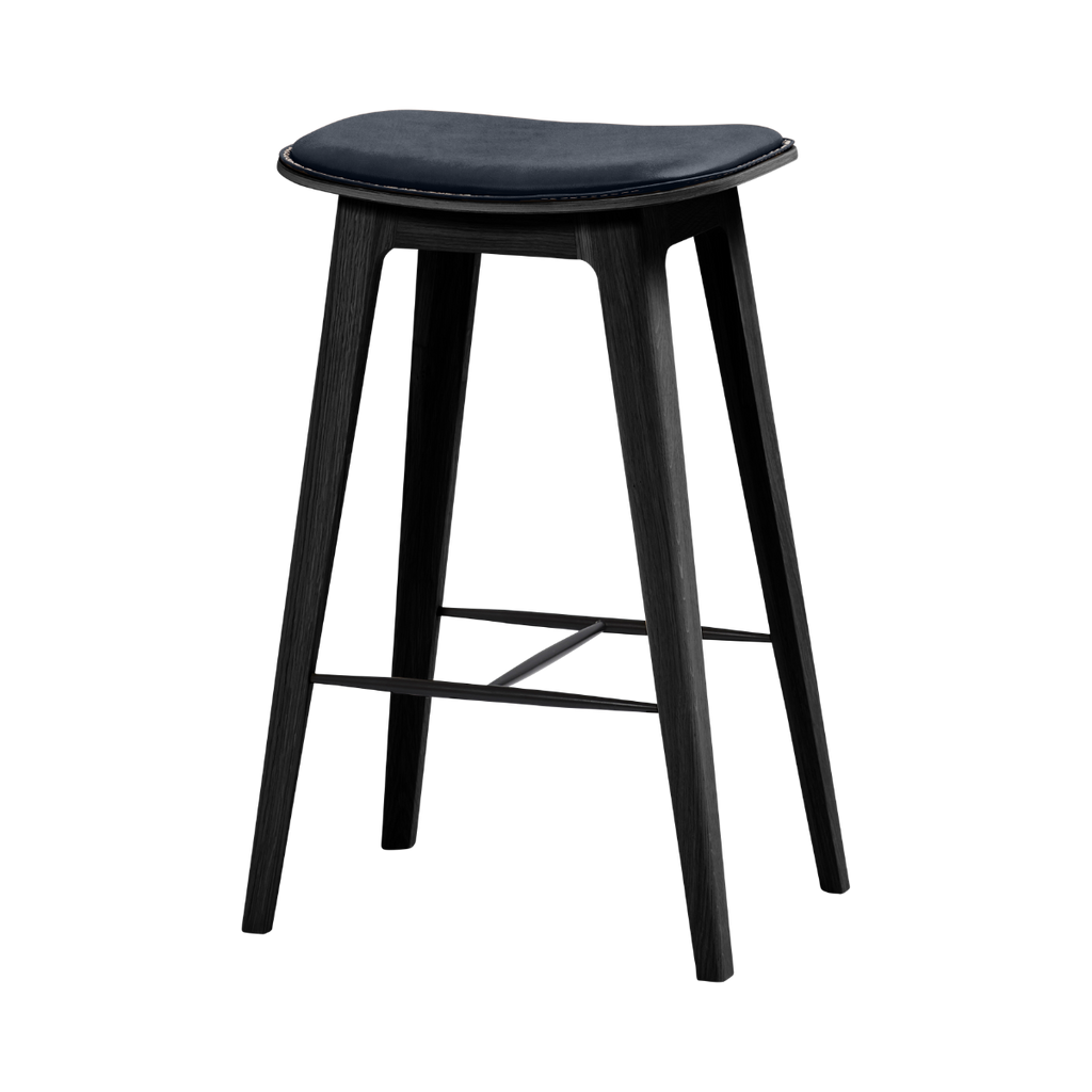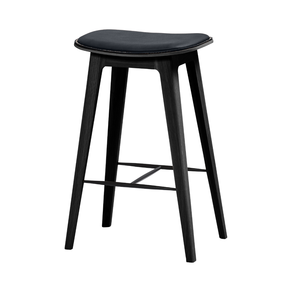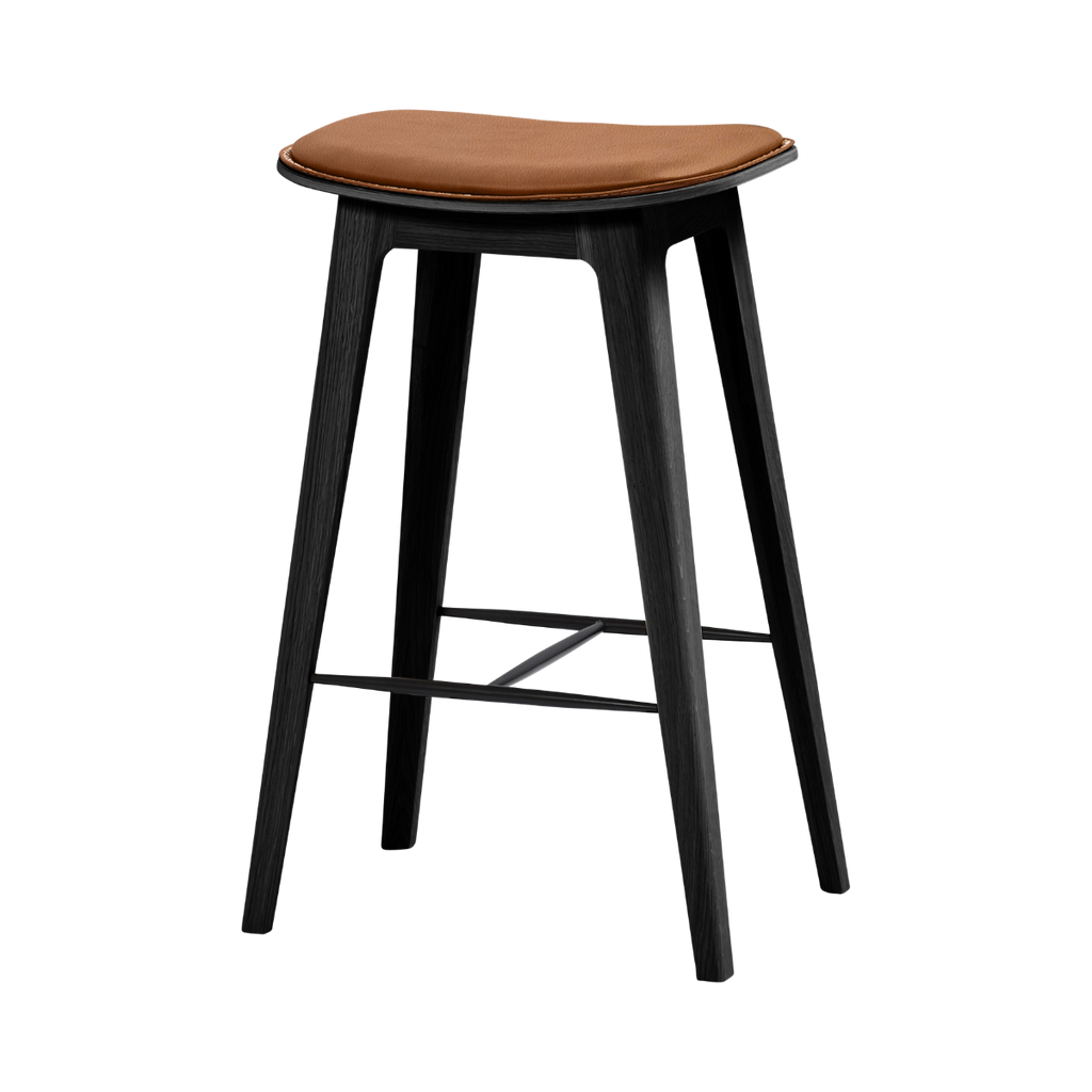 Sædet er polstret i nordisk læder fra SPOOR, hvor hvert stykke kan spores tilbage til det enkelte dyr og den enkelte gård. Den delpolstrede model lader træfladen i sædet være synlig, så materialets naturlige udtryk bevares. Langs kanten finder du de karakteristiske SACKit krydssyninger, som fremhæver håndværket og giver stolen et tydeligt særpræg. Kombinationen af træ og læder giver en barstol, der både føles solid og behagelig at sidde i.