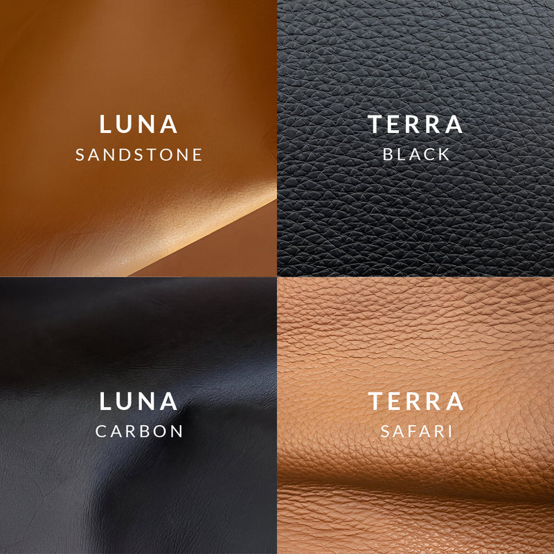 Luna læderet er unikt og får et patineret look over tid, samt er blødt at røre ved. Terra er meget ensartet i læderet og er nemt at holde.