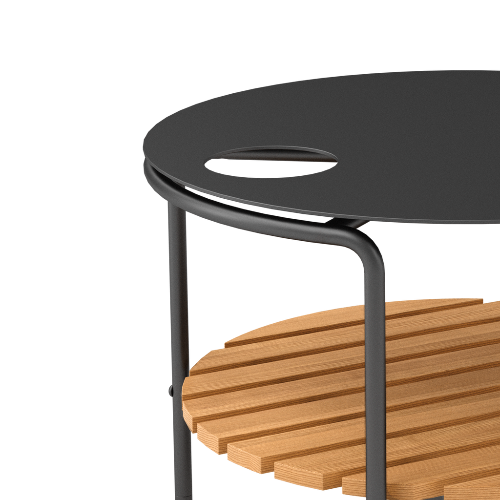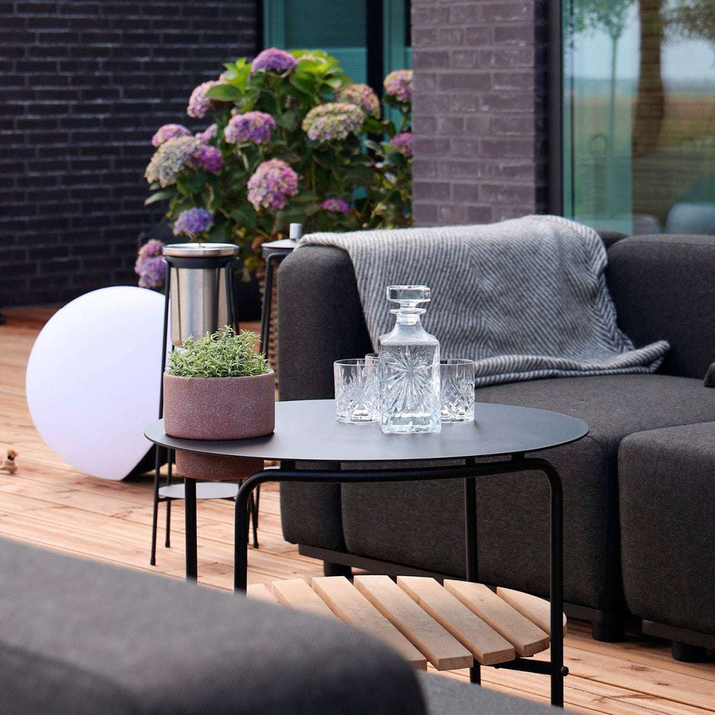 SACKit Patio sofabord er et udendørs sofabord i pulverlakeret aluminium med en hylde i teaktræ. Rene linjer, lækre materialer og et multifunktionelt design tager dit udendørsområde til et nye niveau.