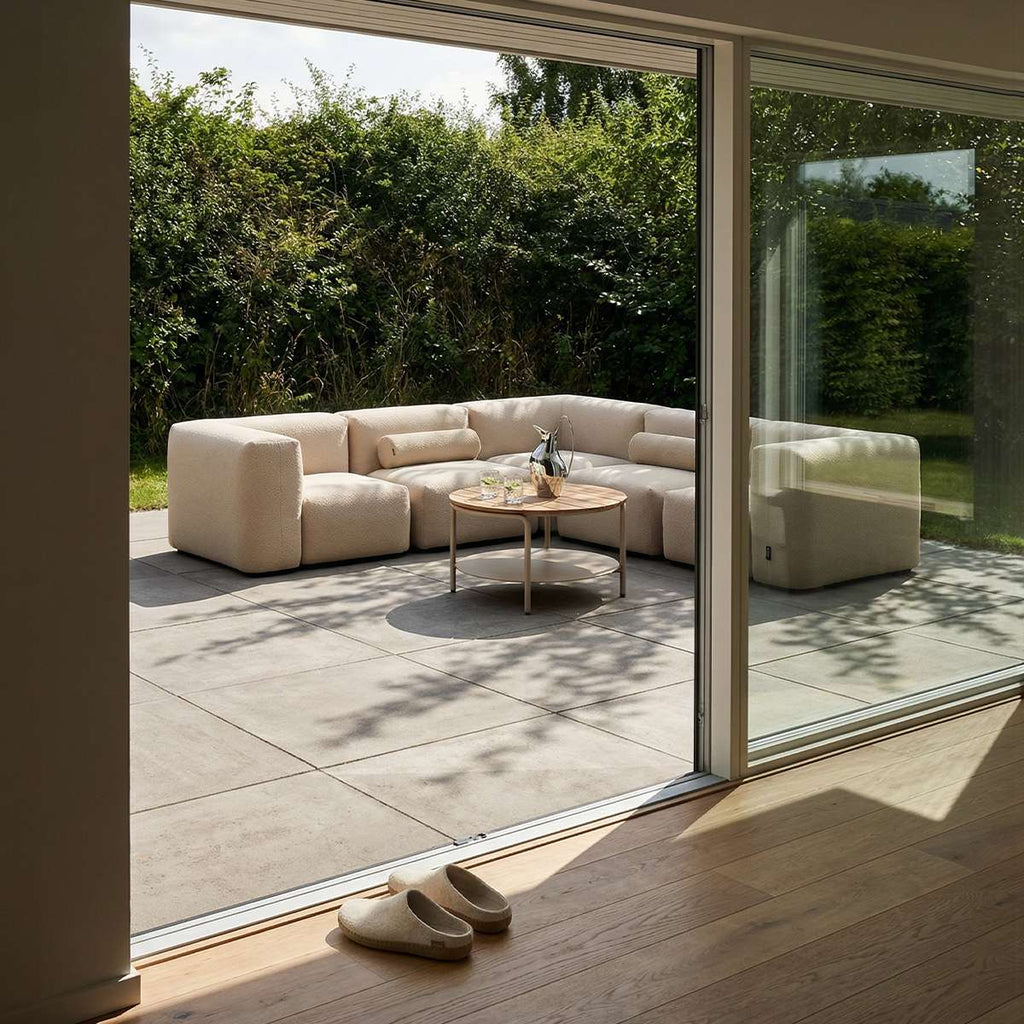 Soft Sofa Outdoor er opbygget med shredded foam, pakket i vandfaste polyesterposer, som sikrer både komfort og form over tid. Betrækket er fremstillet i slidstærkt olefin-tekstil med høj lysægthed, så sofaen tåler sol, vind og regn. Den kan stå ude hele året og er altid klar til brug, uden at du skal flytte den ind, når vejret skifter.